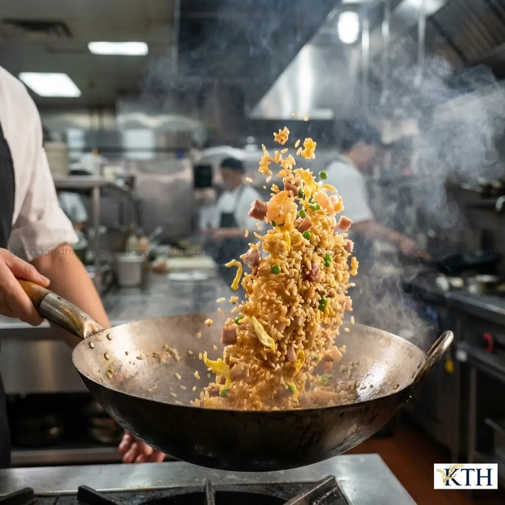 Đầu bếp đang rang cơm chiên Dương Châu bằng chảo lửa lớn sử dụng gạo Jasmine để nguội giúp hạt cơm săn lại.