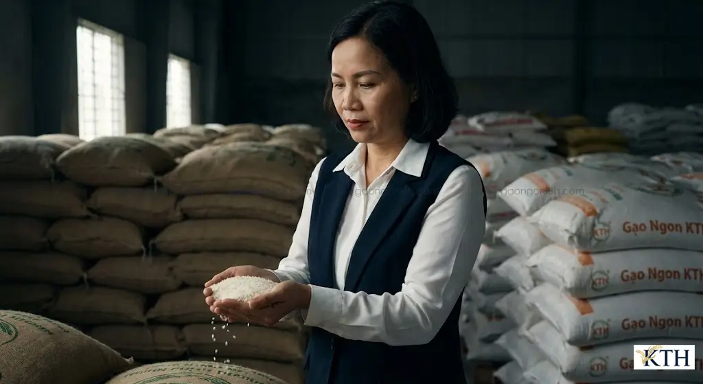 CEO Đỗ Thị Nga Xô trực tiếp kiểm tra từng lô gạo tấm nhập kho để đảm bảo độ cũ và độ khô chuẩn xác cho khách hàng.