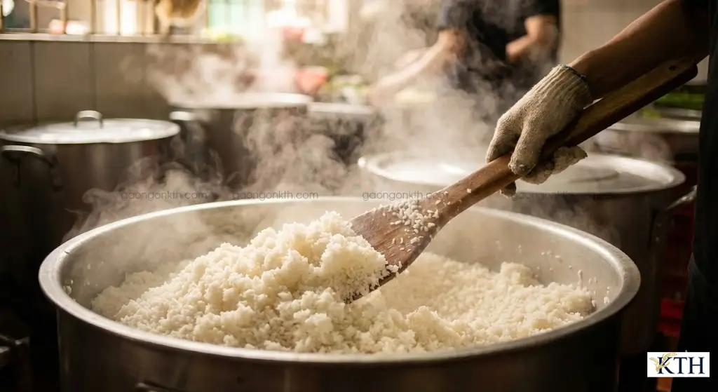 Kỹ thuật xới cơm tấm 504 chín tới, hạt cơm nở bung, tơi xốp, không bị nhão hay bết dính trong nồi công nghiệp.