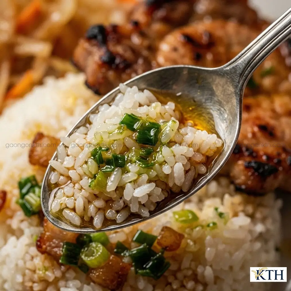 Đây là chất xúc tác bắt buộc. Mỡ hành thấm vào hạt tấm làm cho hạt cơm bóng bẩy, trơn tru và thơm lừng.